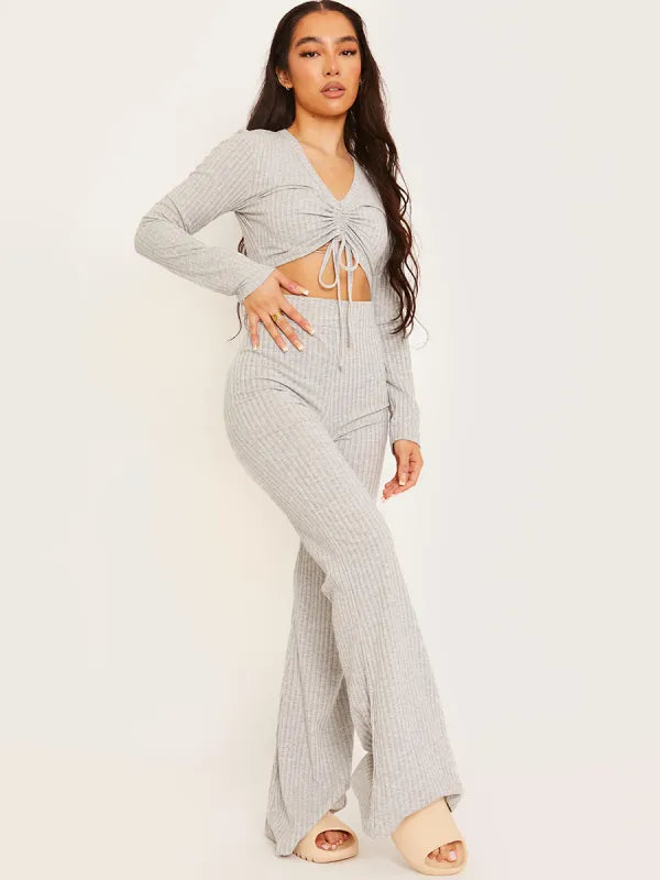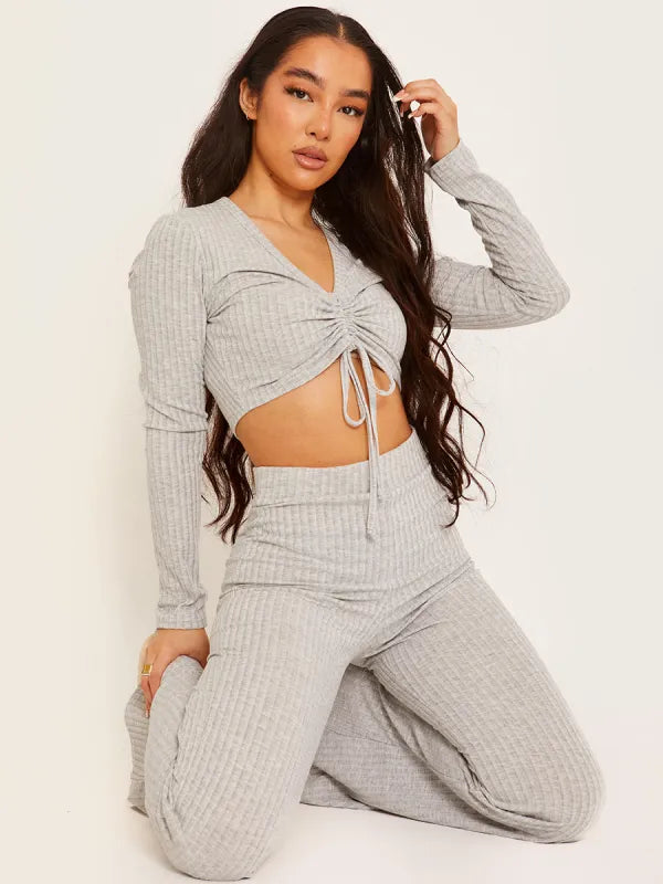 Ribbed Ruched Crop Top & Flared Trouser